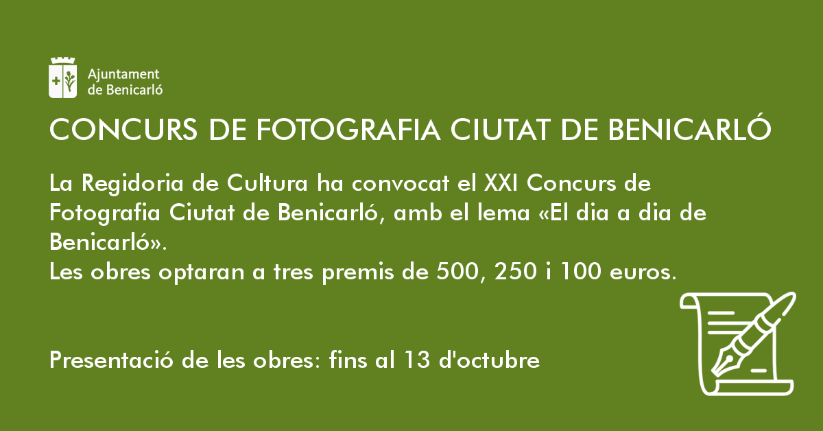 La Concejalía de Cultura ha convocado un año más el Concurso de Fotografía Ciutat de Benicarló, con el lema «El día a día de Benicarló». Las obras, que tienen que ser originales e inéditas, se pueden presentar hasta el 13 de octubre y optarán a tres premios de 500, 250 y 100 euros.