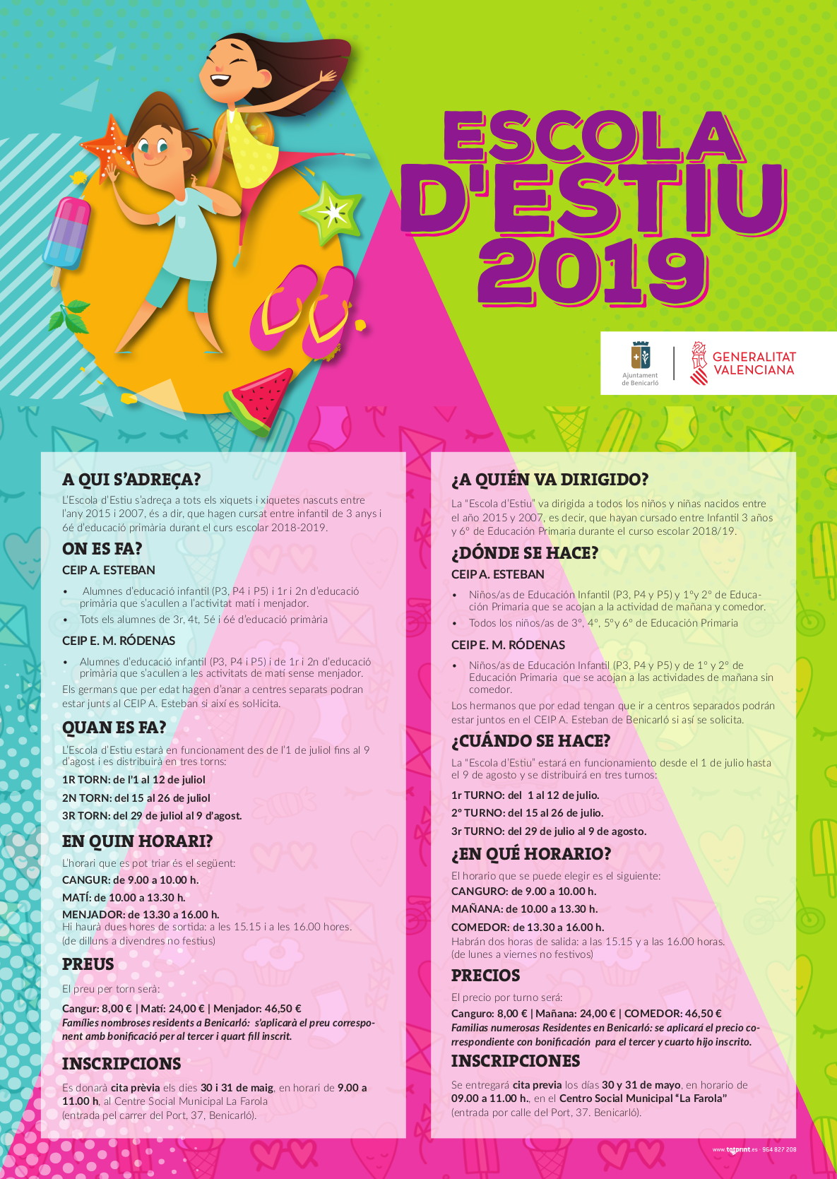 La Escuela de Verano del Ayuntamiento de Benicarló, para niños y niñas de entre 3 y 12 años, abrirá las puertas el 1 de julio y dará servicio hasta el 9 de agosto. El proceso de inscripción empezará el día 30 y 31 de mayo con el reparto de citas para más tarde poder formalizar la matrícula en el turno asignado.