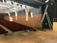 Por otro lado, se está teniendo mucho cuenta la iluminación de este recinto y por esto se trabaja en el cambio de iluminación de los lavabos, el hall de entrada, los pasillos de las butacas y el interior de la sala. También se ha repasado el cableado de la iluminación del escenario y se reforzará con luz de trabajo la caja escénica.