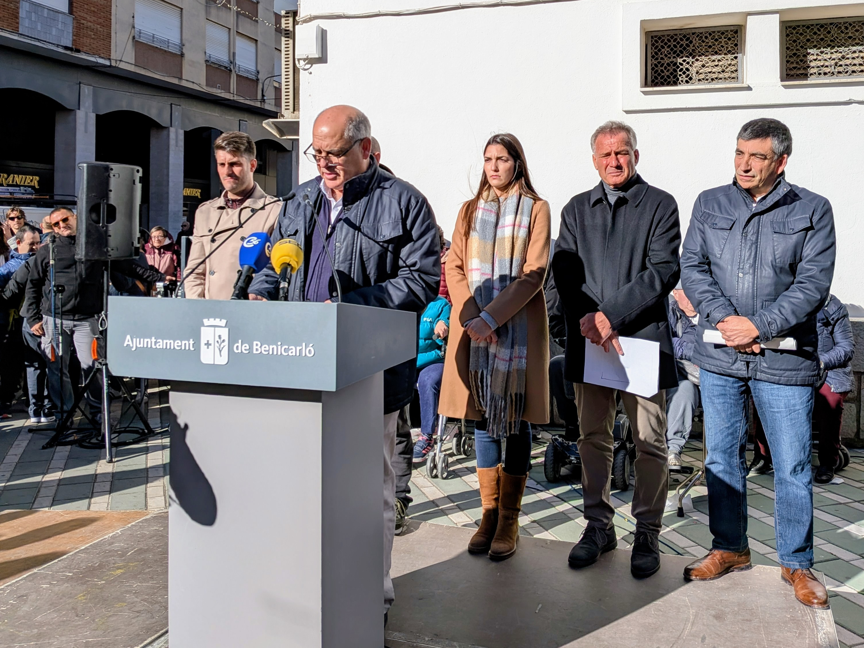 El alcalde, Juanma Cerdá, acompañado del concejal de Servicios Sociales y Políticas Inclusivas, Carlos Delshorts, y los concejales y concejalas Mireia Mancheño, del PSPV-PSOE; Enrique Besalduch, de Benigazlum; Jordi Maura por parte de Compromís; y Antonio Fornés en nombre de VOX, han leído el documento que manifiesta «una defensa activa de los derechos para mantener y ensanchar las defensas sociales».