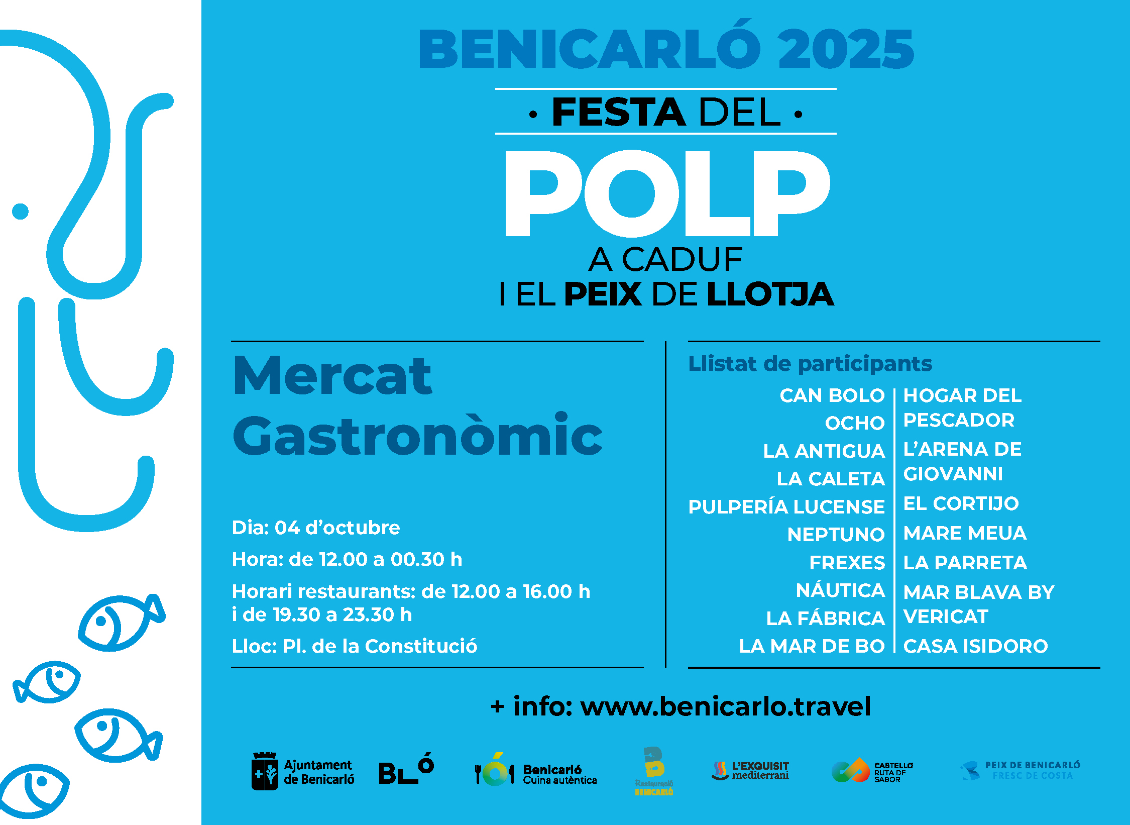 Dissabte 4 d'octubre, els 17 establiments que participen en la Festa del Polp a Caduf i Peix de Llotja oferiran les millors propostes gastronòmiques en una intensa jornada que s'allargarà de les 12.00 a les 00.30 hores. Juntament amb la gastronomia, s'ha programat una àmplia programació musical.