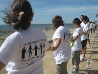 Vora 2.300 escolars dels centres educatius de Benicarló han participat aquest matí en una cadena humana per sensibilitzar la ciutadania sobre les conseqüències del consum de tabac. Els participants han col·locat 21.000 paquets de tabac en fila, que és el que es calcula que consumeix una persona fumadora al llarg de la seua vida.