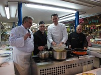 El Mercado de Benicarló ha dado oficialmente la bienvenida a la Navidad con la colaboración de la Agrupación de Restauradores, que han elaborado en directo un delicioso menú navideño: langostinos al limón, vieira de langostinos y alcachofas, sopa de pescado, panaché de verduras, dorada con patatas y costillas de cordero lechal con verduras. Además, han elaborado un surtido de dulces que se han repartido entre los clientes del Mercado. El menú se ha sorteado entre los cuatro mil tickets depositados por los clientes que han comprado durante toda la mañana en el Mercado.