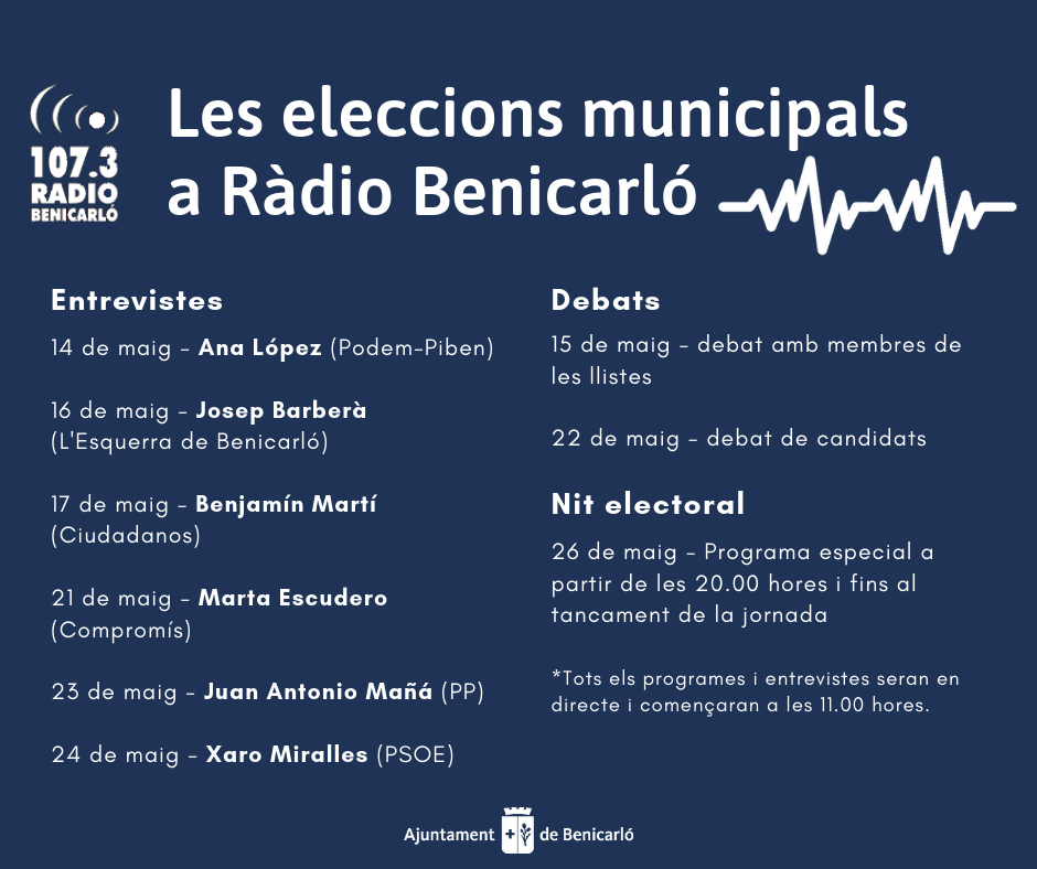 Ràdio Benicarló ha preparado una serie de especiales acerca de las elecciones municipales del 26 de mayo, que empezará con una ronda de entrevistas a cada uno de los candidatos a la alcaldía de Benicarló, tengan actualmente representación en el Ayuntamiento o no. La duración de las entrevistas se ajustará en función de criterios basados en la proporcionalidad y el derecho a la información, y se efectuarán con orden de menor a mayor representación en el Ayuntamiento: el partido que obtuvo menos votos en las anteriores elecciones municipales será el primero entrevistado, mientras quien obtuvo más será el último.
