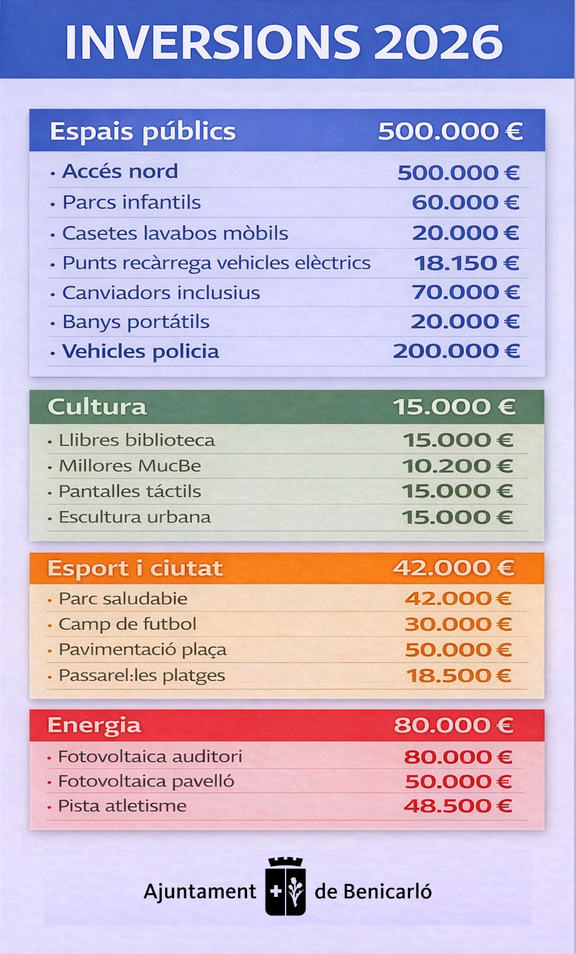 Otras inversiones destacadas son la renovación de vehículos eléctricos de la Policía Local, la renovación de los parques infantiles, el nuevo baño público en el Mercado, puntos de recarga eléctrica, el parque saludable, la mejora de la plaza Sant Bartomeu o la instalación de placas solares en edificios municipales.